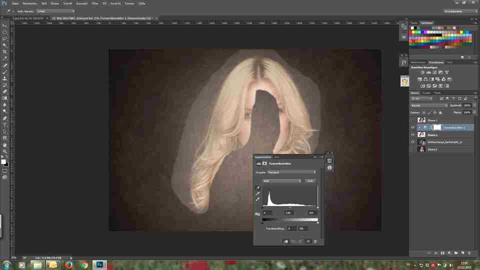 Das sieht jetzt zwar schon besser aus, aber der alte Hintergrund schimmer immer noch gräulich durch. Transparent wäre es nur, wenn dieses grau schwarz wäre und damit transparent. Dies geht mit einer neue Einstellungsebene „Tonwertekorrektur“. Diese neue Einstellungsebene darf sich aber nur auf die darunter liegende Ebene auswirken und nicht auf die anderen. Deshalb setzen wir eine Schnittmaske (siehe roter Pfeil). In dem Dialog gibt es links drei Pipetten. Die oberste ist für die Schwarzpunkte im Bild, die mittlere für die Graupunkte und die unterste Pipette für die Weißpunkte. Wir nehmen hier die Pipette für die Schwarzpunkte und klicken damit auf einen gräulichen Bereich. Dadurch wird dieser Bereich gezwungen schwarz zu werden und somit transparent.